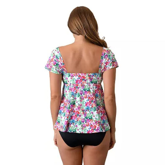 Women's A Shore Fit Marley Print Shirred Sleeve Bandeau Swim Top - Floral -6-NWT